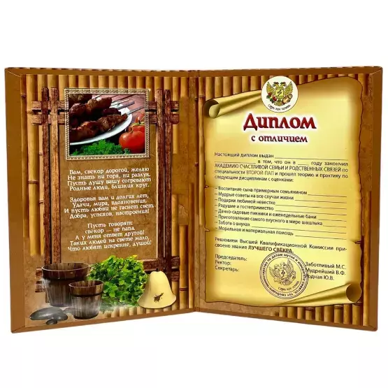В мире подарков особое место занимает шуточная открытка прикол. Это не просто кусочек плотного картона с картинкой, это целая вселенная добрых шуток, которая украсит любую вечеринку, будь то юбилей, День рождения или профессиональный праздник близкого Вам человека. Создание такой открытки – это искусство. Дизайнерская атрибутика, оригинальные стихотворения, наполненные юмором и неподражаемым стилем, делают каждую открыточку неповторимой. Именно поэтому она будет наградой для именинника, символом внимания и уважения к его чувству юмора. Грамота может быть выполнена в виде забавного сертификата и содержать прикольные пожелания, которые заставят улыбнуться даже самую серьезную персону. Диплом со смешным подтекстом будет прекрасным дополнением к основному презенту, а его не дорогая стоимость позволит приобрести сюрприз без ущерба для Вас Не стоит недооценивать эффект от такого торжественного поздравления. Ведь иногда маленький, но остроумный дар, способен вызвать самые яркие эмоции и оставить незабываемые впечатления у родных и друзей. Такая открытка станет замечательным сувениром, который сохранит память о знаменательном событии на долгие годы. В продаже два дизайна диплома.
